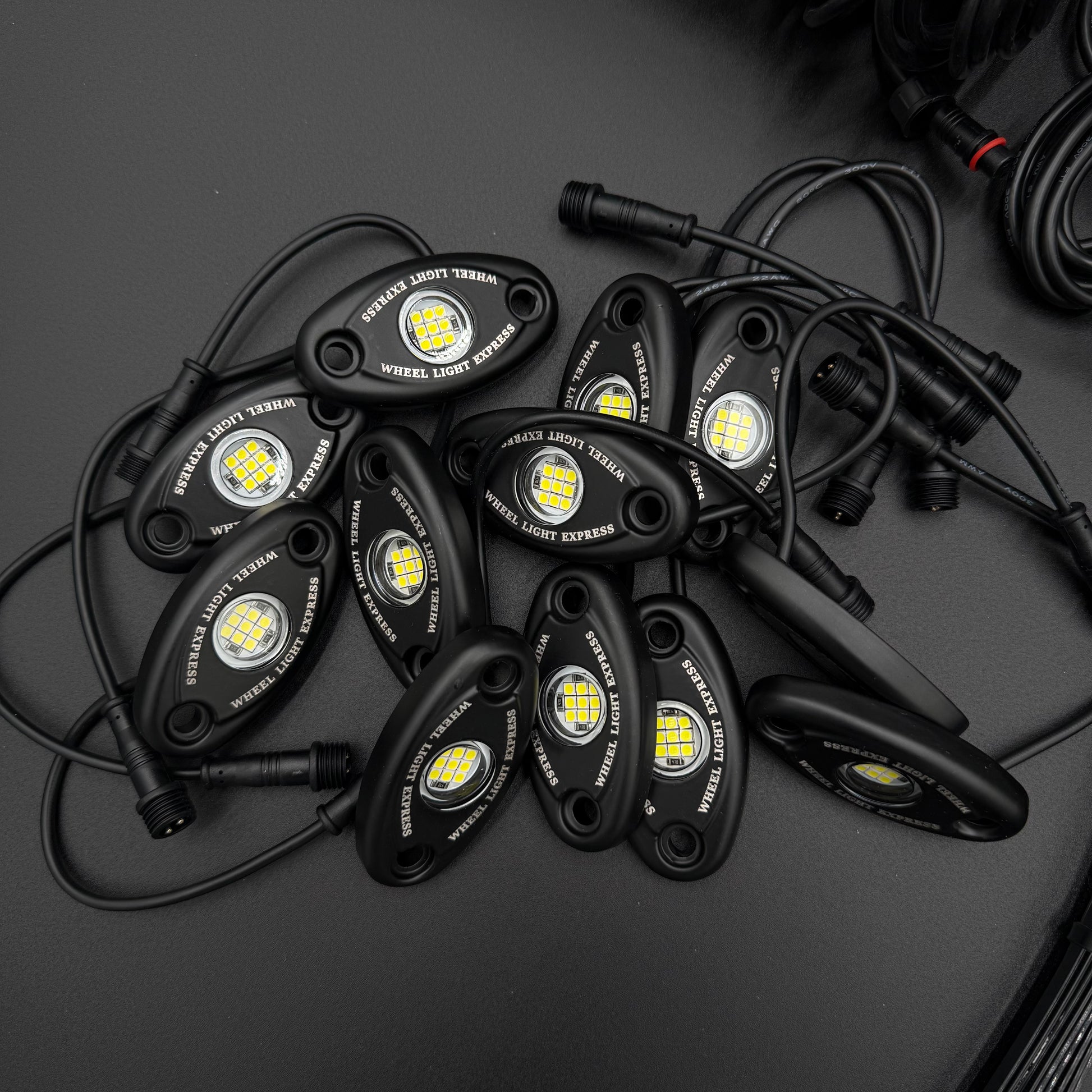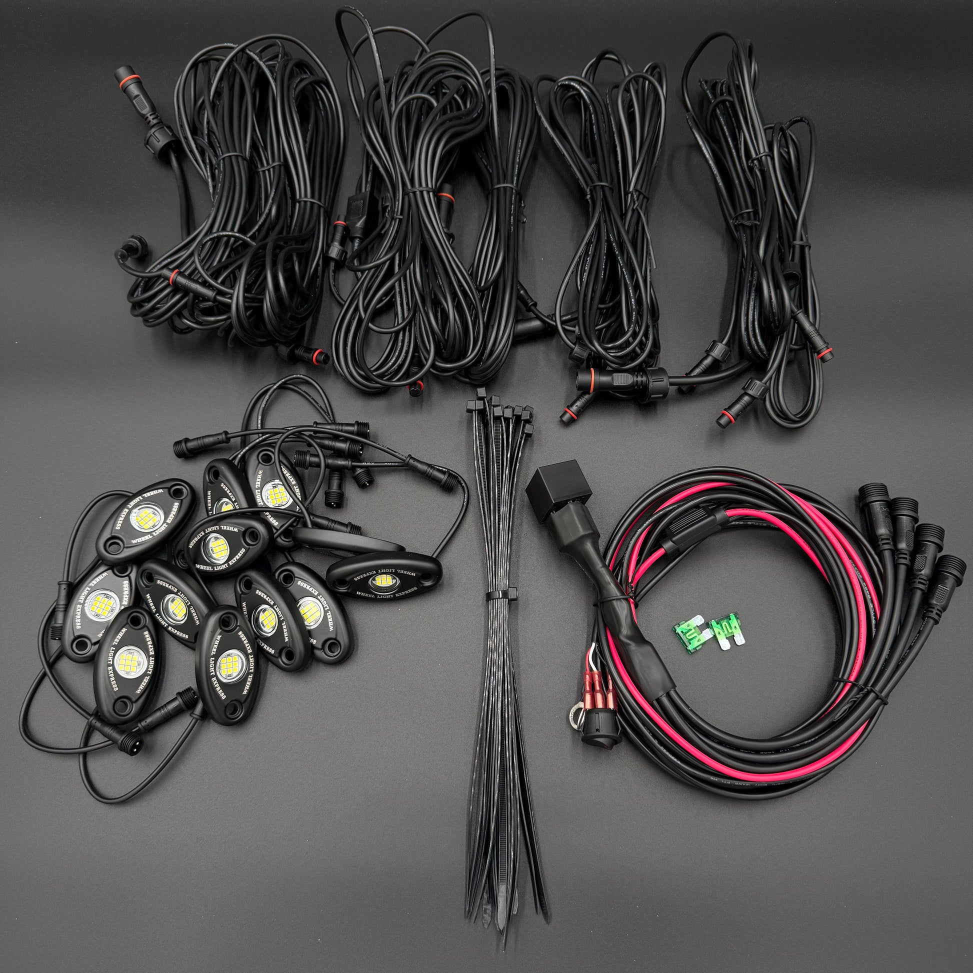 12 Rock lights with a full plug and play wire harness! Comes with all necessary hardware and zip ties, this is a complete rock light installation with everything necessary for installation!