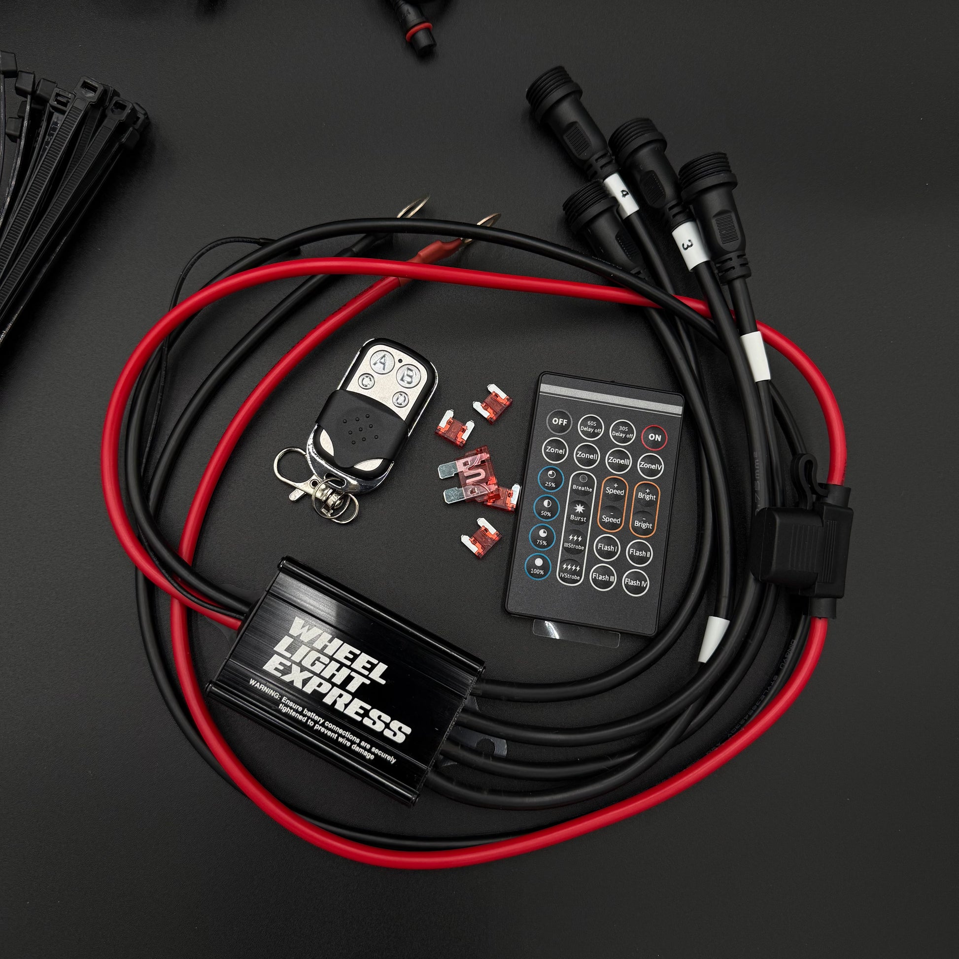 Moreover, all leads boast an overkill 18-gauge wire, ensuring a smooth and robust power flow, enabling high-density wheel lights to effortlessly illuminate. The utilization of an oversized gauge wire significantly enhances the wire harness's overall efficiency, drawing less power while exponentially increasing the brightness of the wheel lights.