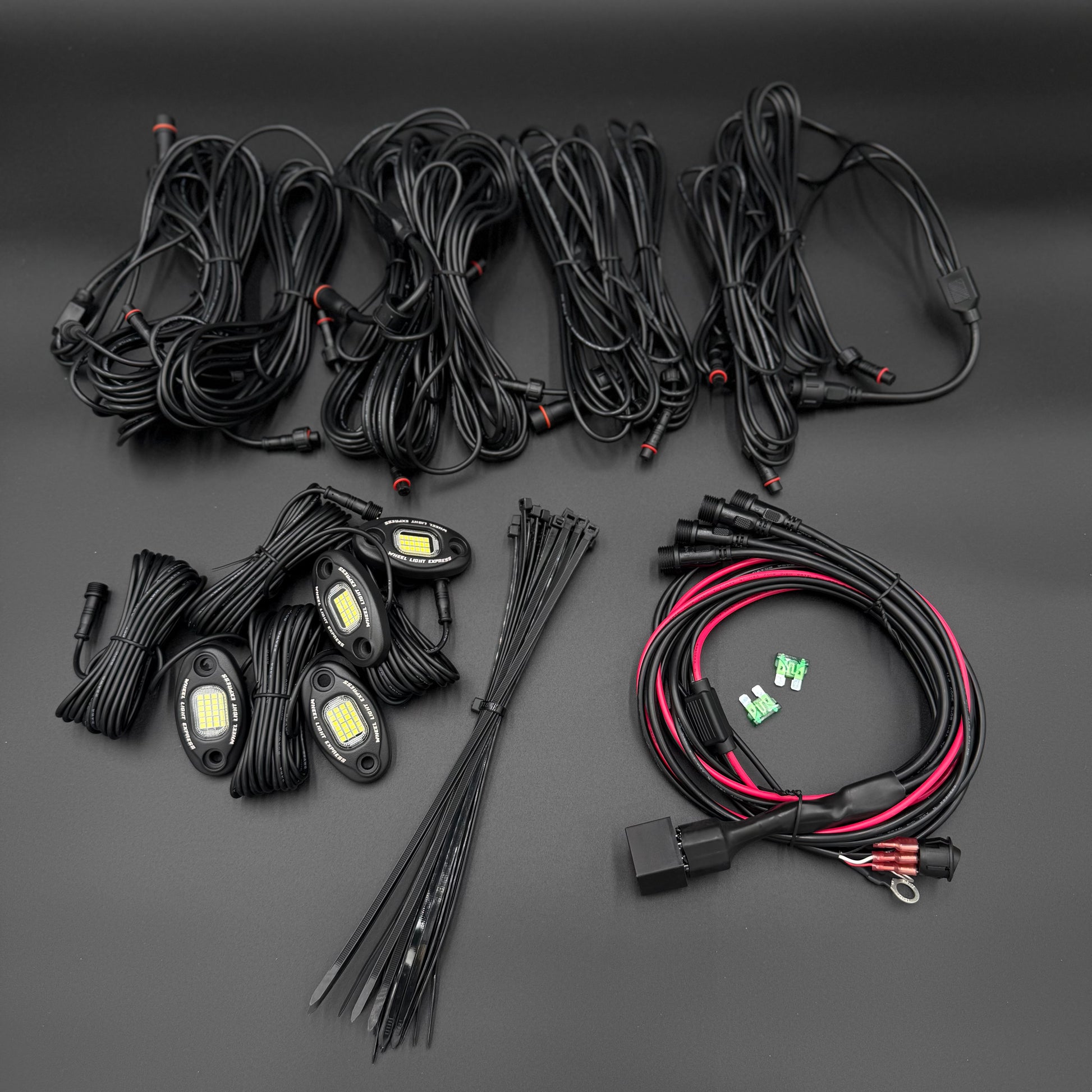 4 Rock lights with a full plug and play wire harness! Comes with all necessary hardware and zip ties, this is a complete rock light kit with everything necessary for installation! This kit is built for easy installation and long lasting durability making them the best way to light up the underside of your truck or car! Sets are custom made by hand in the USA.